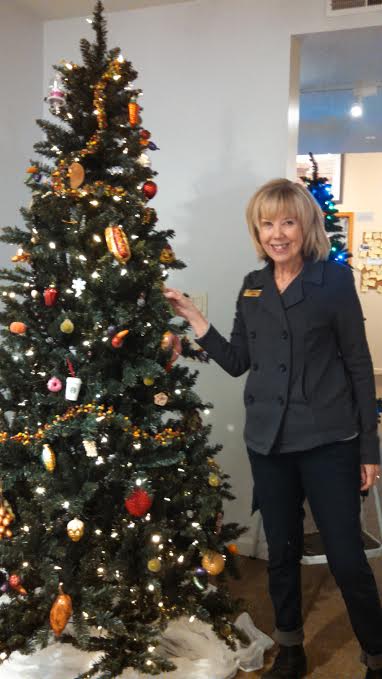 Our tree was sponsored by the Community Food Bank at Lift Up. Ninety or ninety-five percent of the “food-themed” decorations that went on the tree were donated to the thrift store or came from recycled materials. Georgi, a very creative and energetic person had used her skills to make some of the ornamental food from plastic bags and “Mod Podge,” a crafting material. She also made the tree topper – a red chef’s hat. The tree turned out beautiful. Here are a few pictures.