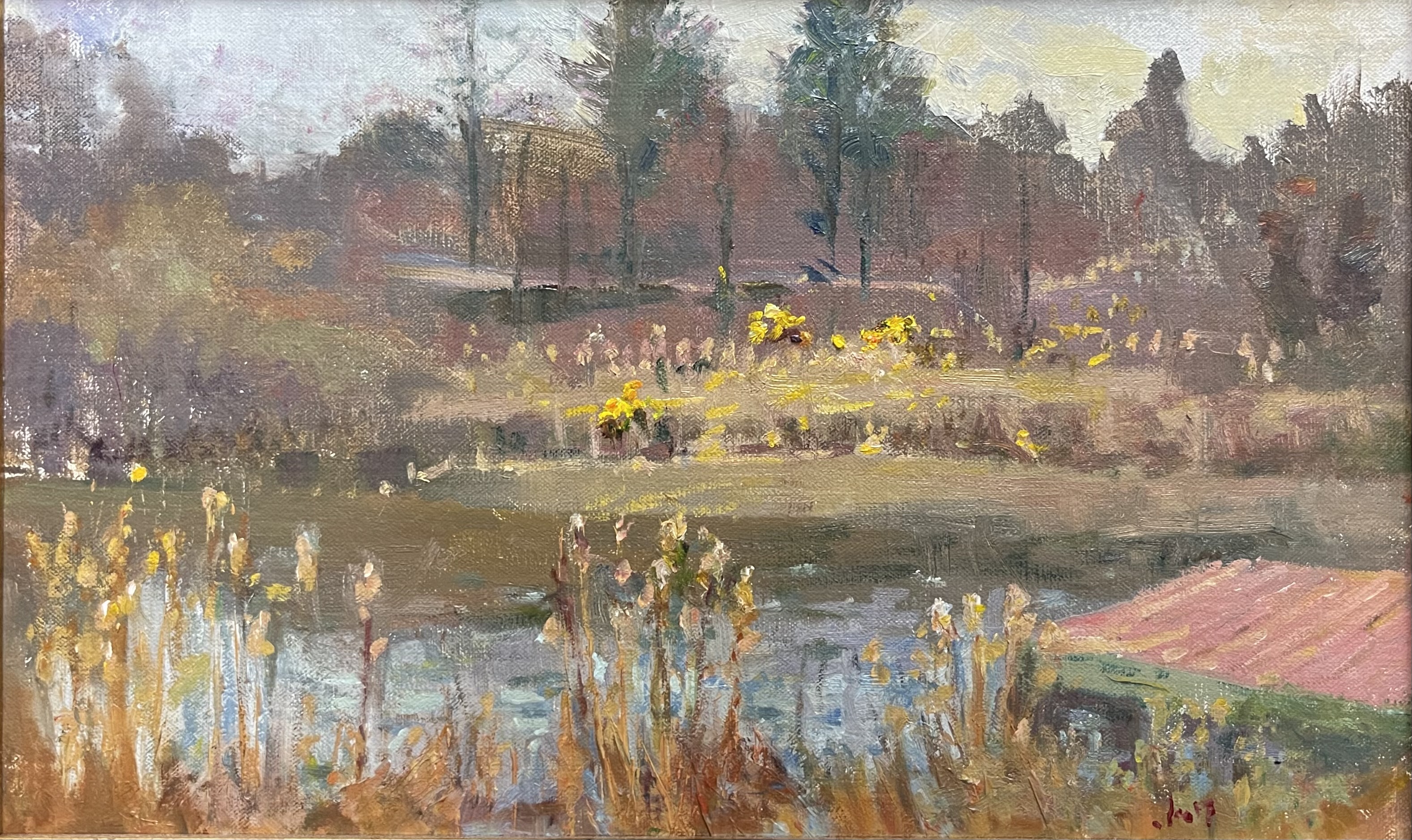 Although she does some studio work, Janice’s love for plein air painting often finds her in gardens and outdoors settings. Her paintings are well-executed because she is skilled at bringing different light and atmospheric variables to the canvas. For collectors who have an appreciation of the difficulty that it takes to get it right, they will fully appreciate what they see. Particularly telling is her only coastal/seascape painting in her current exhibit. The horses with people riding on the beach is only one of many of her exceptional oils. To my eyes, in “Morning Ride” the artist brings a bit of an “old world quality” to the canvas.