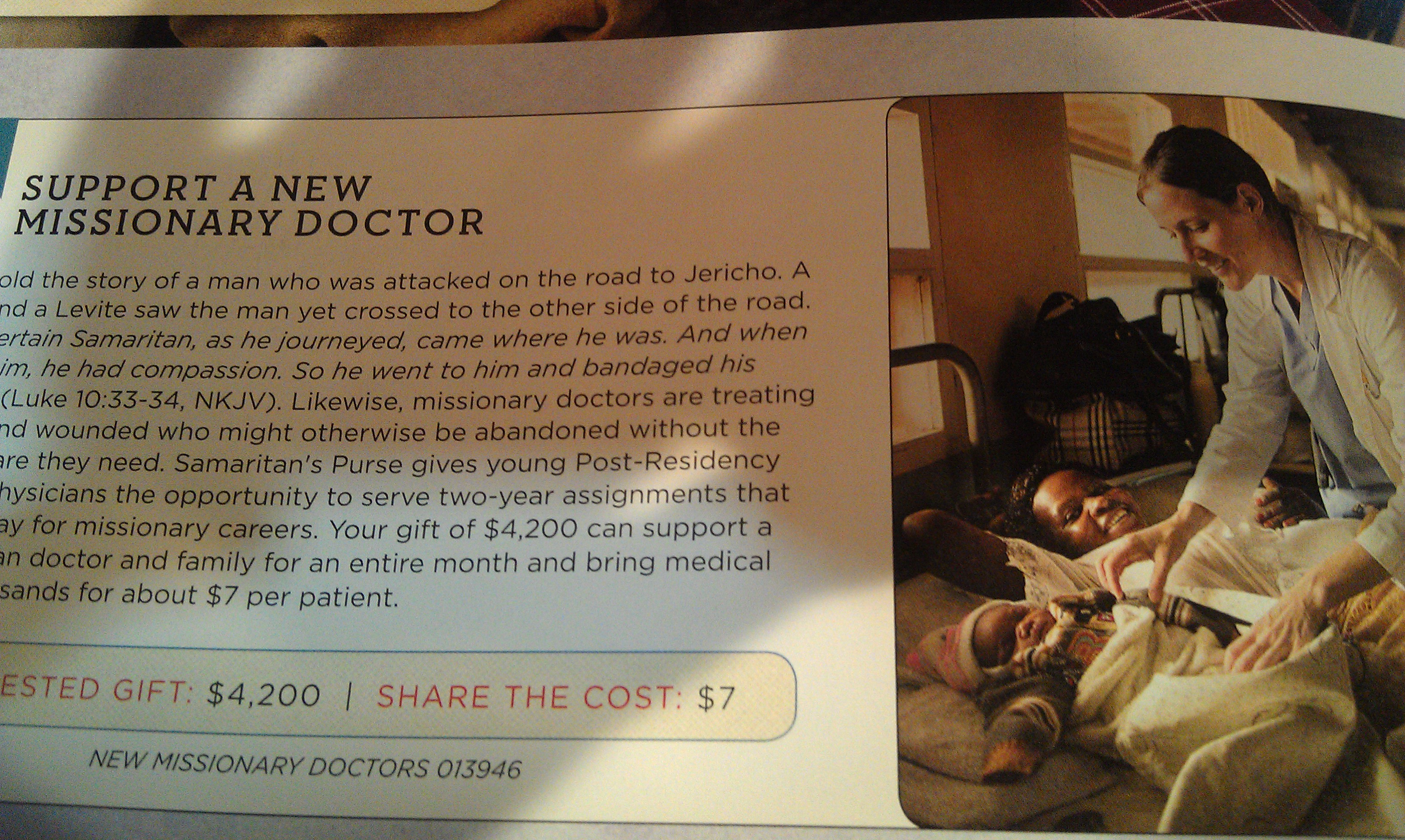The catalog that interested me the most was Samaritan’s Purse. Not only because you can order gifts that fit every budget, but also because of the humanitarian benefit that comes with giving from it. It’s fulfilling to know that each present gives the receiver a sense of hope.